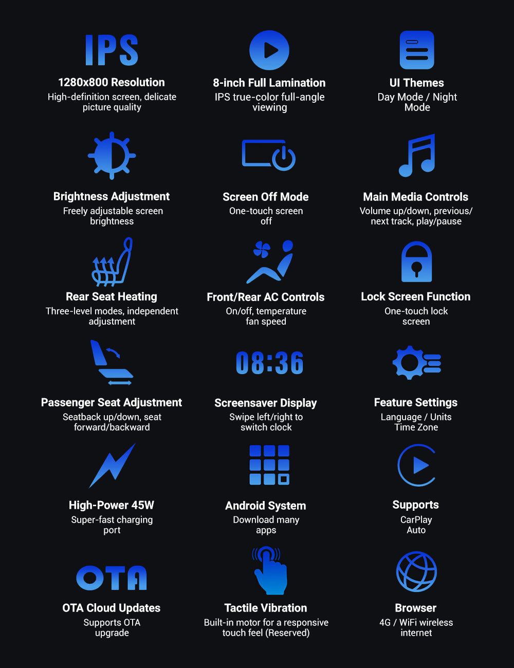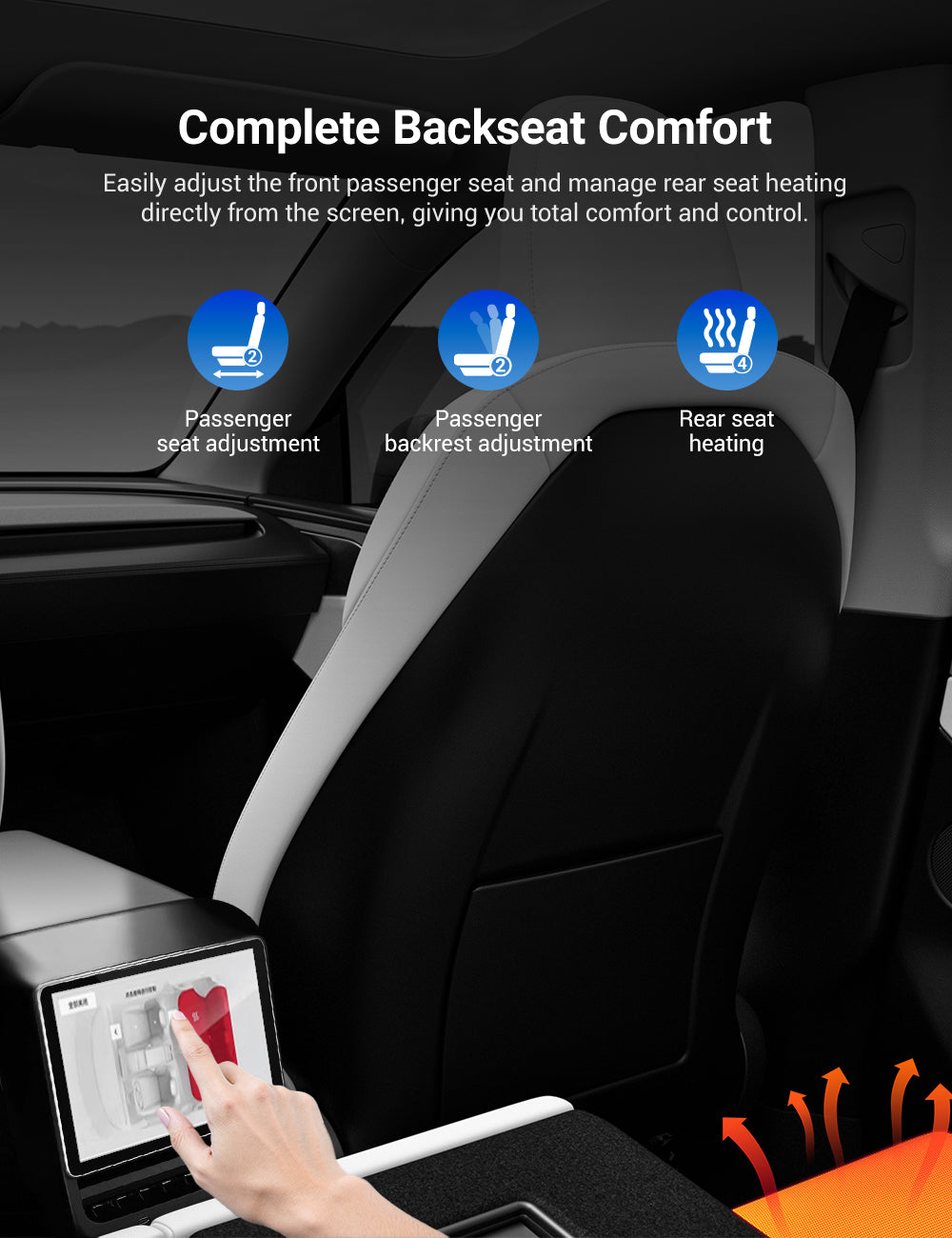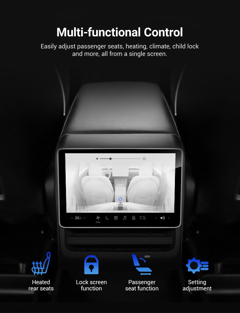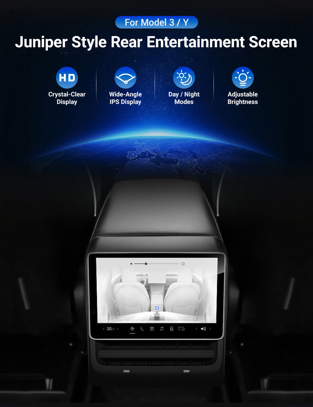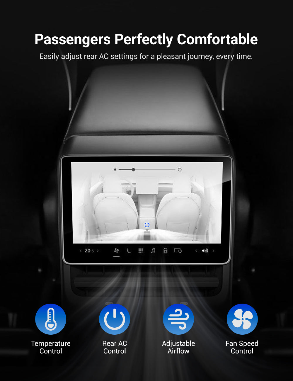 Model 3 Highland & Model Y Juniper arka ekranlarından ilham alınmıştır. Klima ve koltuk ısıtma kontrolleri ile kesintisiz, fabrika tarzı arka koltuk eğlencesi yükseltmesi isteyen Tesla sahipleri için özel olarak tasarlanmıştır.