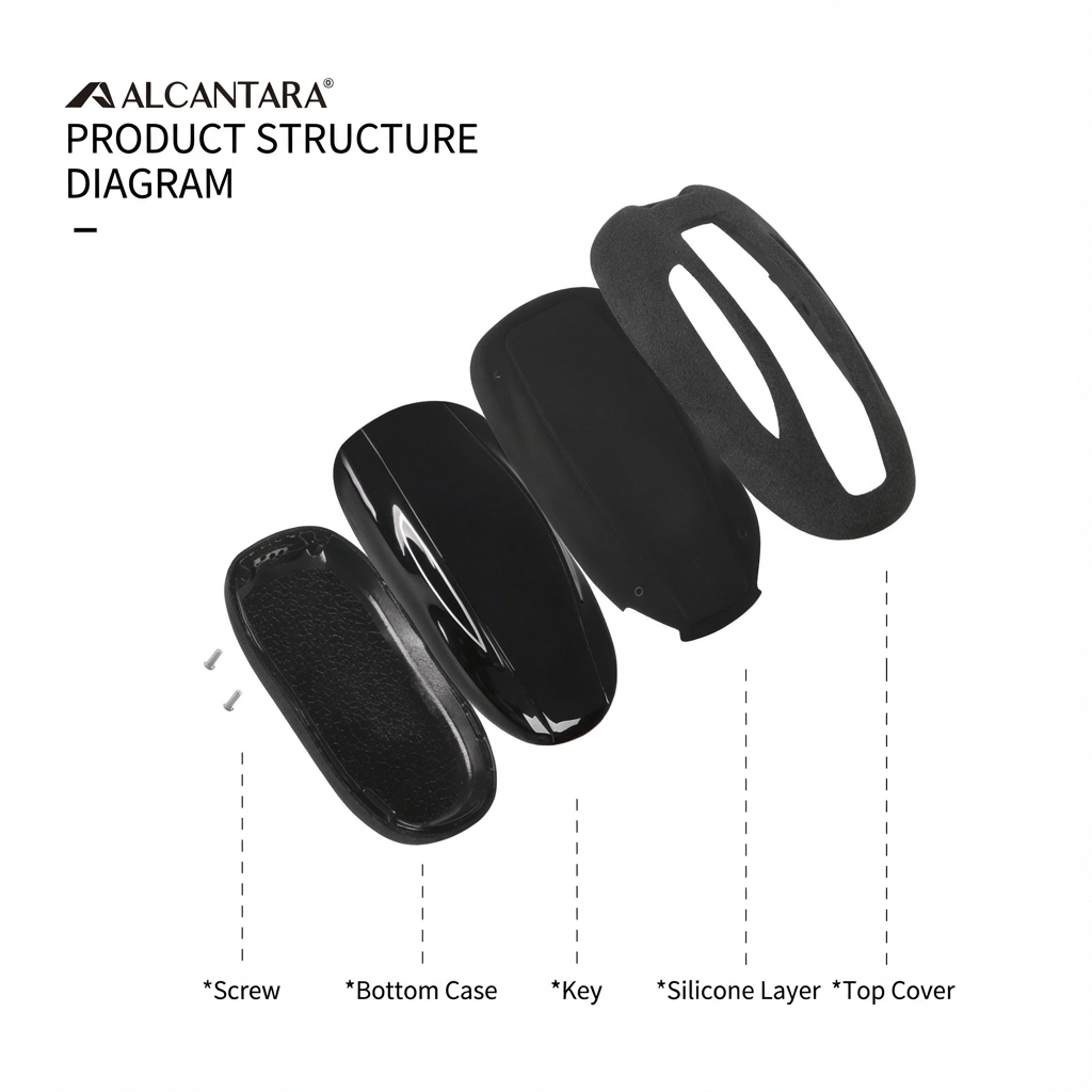 The key cover features a premium Alcantara top for a sophisticated grip, backed by a shock-absorbent silicone core for 360° impact protection. The assembly is anchored by a reinforced bottom case and locked with precision screws, ensuring a rugged, mechanical fit that keeps your key secure and stylish in any condition.