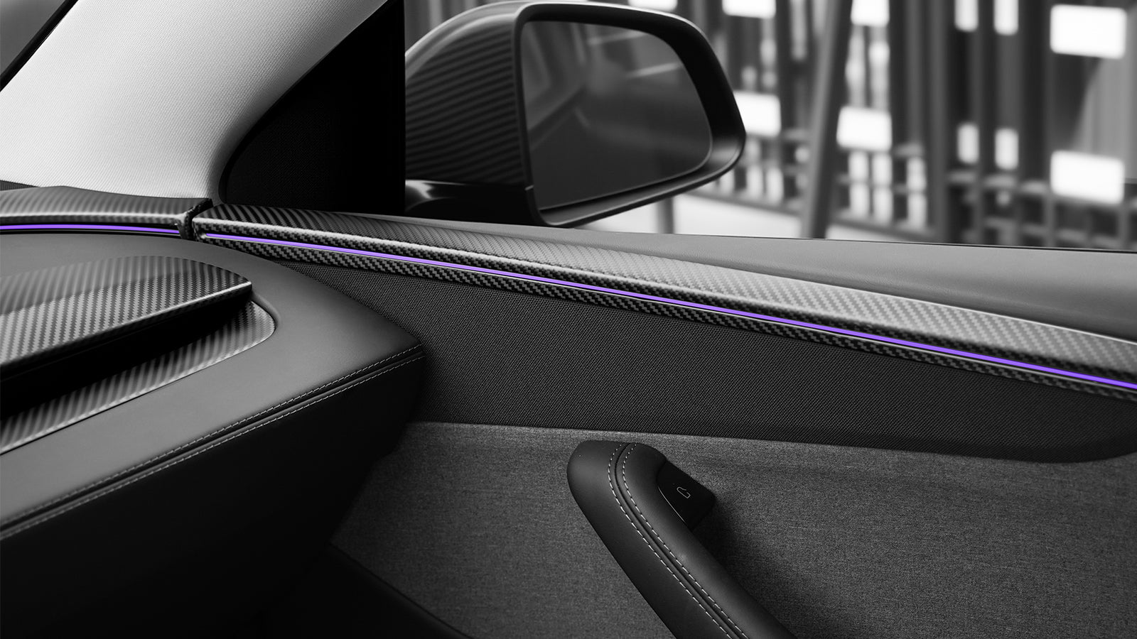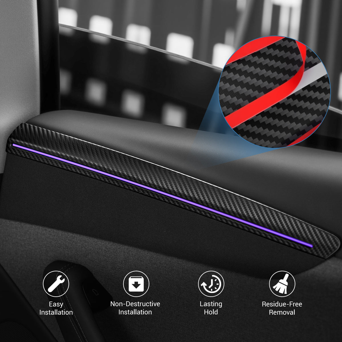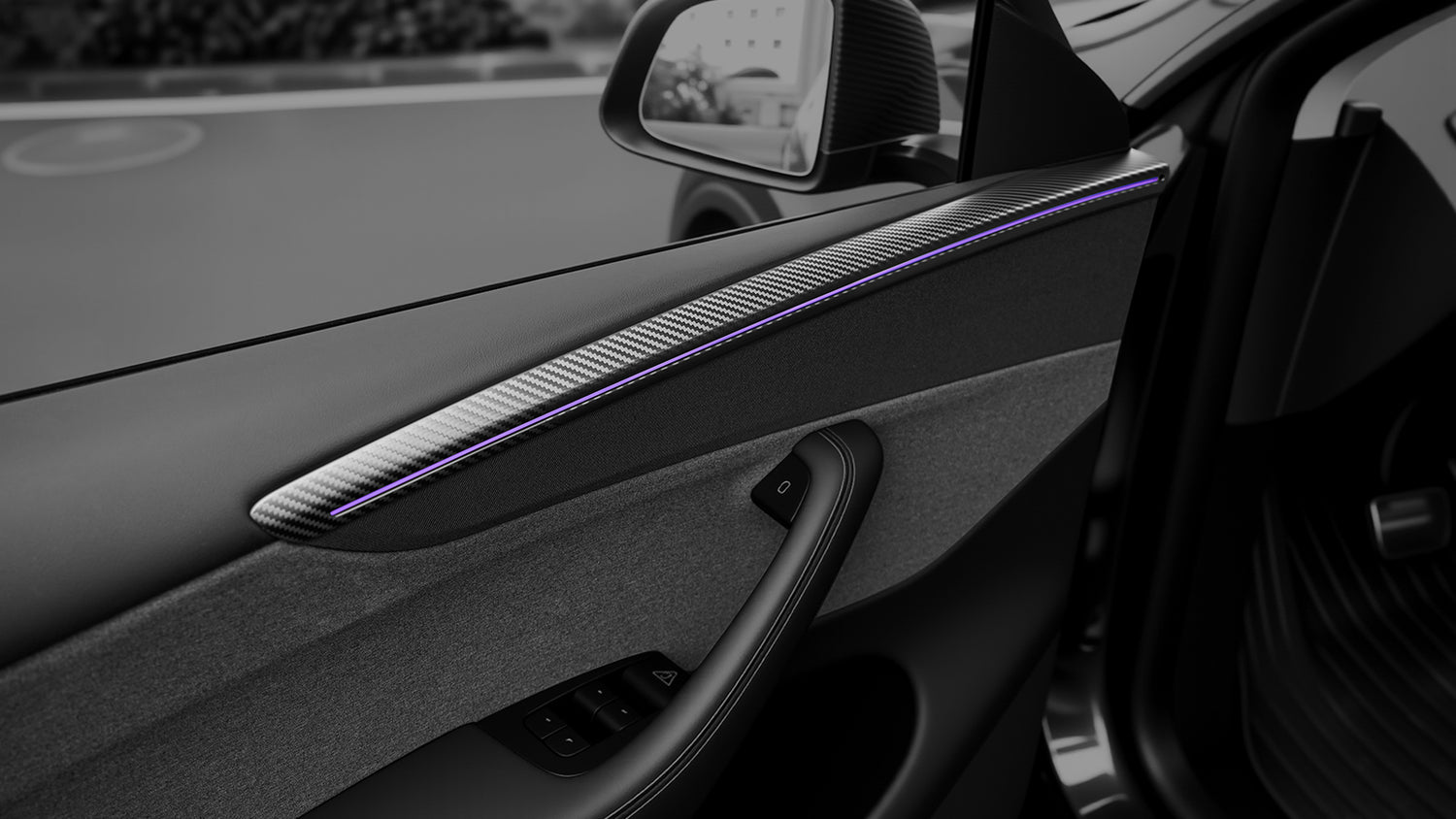 Upgrage your Model Y Juniper interior with genuine dry carbon fiber door trim covers. Precision-molded 1:1 from OEM data and lightweight durability, these overlays bring a luxury touch while protecting your original panels from scratches and wear. Seamlessly integrates with factory ambient lighting—no glare, no obstruction.