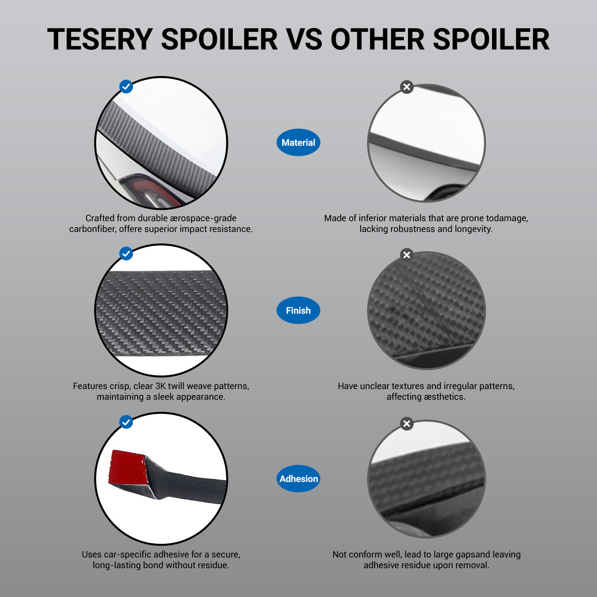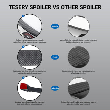 Lightweight. Rigid. Stunning. Our carbon fiber offers a tighter weave, deeper gloss, and superior durability. Whether you're cruising the highway or pulling up to a Tesla meet, this spoiler delivers form and function. Streamlines airflow over the rear, reducing drag and stabilizing your ride at high speeds.